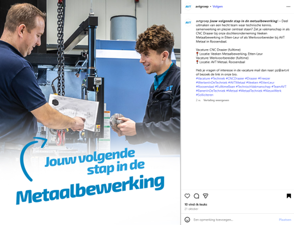 Hashtags bij een recruitment post van concurrent AVT