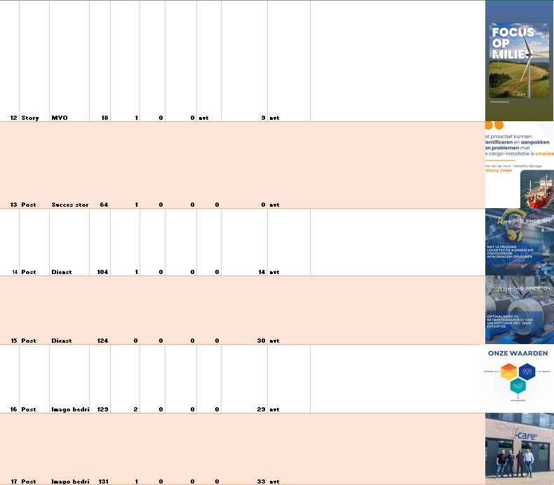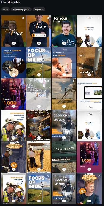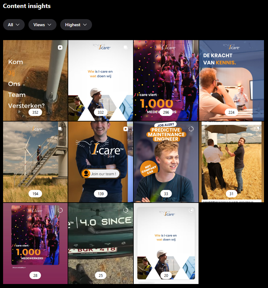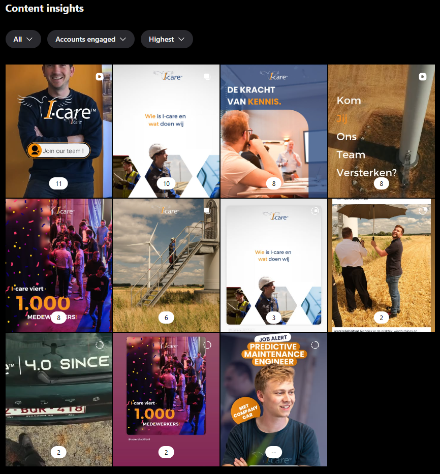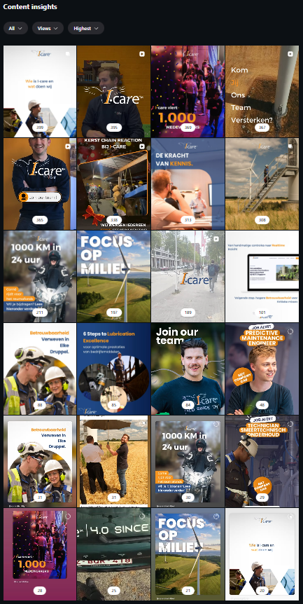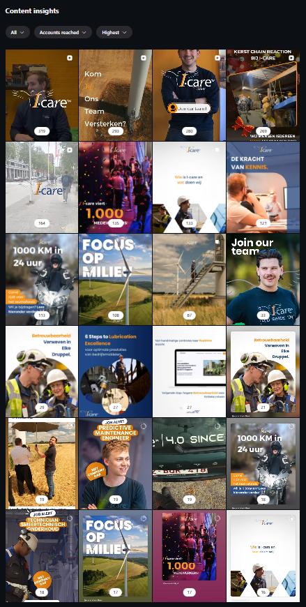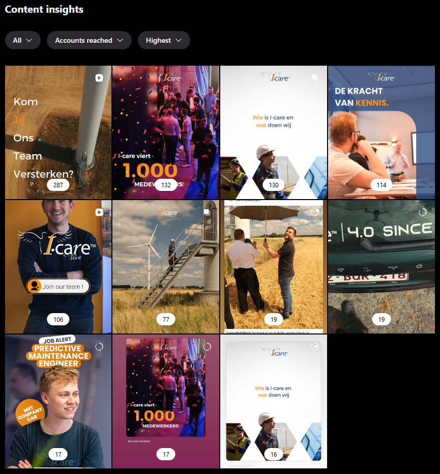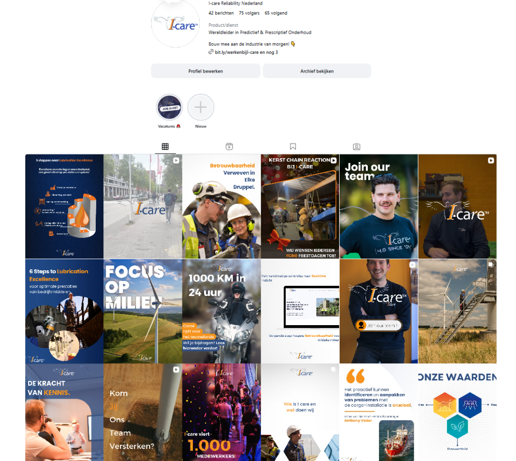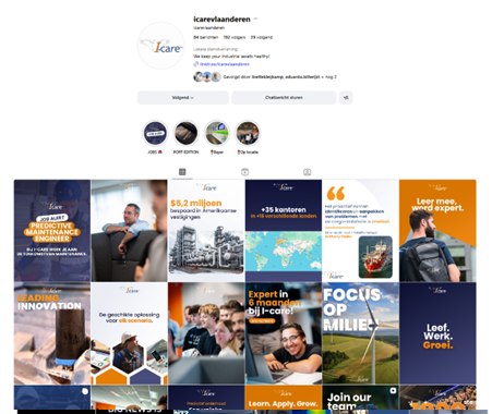 Dit is heel goed gedaan. Heel goede variatie tussen de content. Video en gewone foto. Sfeerbeelden, informatie wat I-care doet, focus op de collega’s,…  Dit is leuk voor de volgers van socials. Voor mogelijke klanten die de socials volgen, huidige en toekomstige collega’s,…