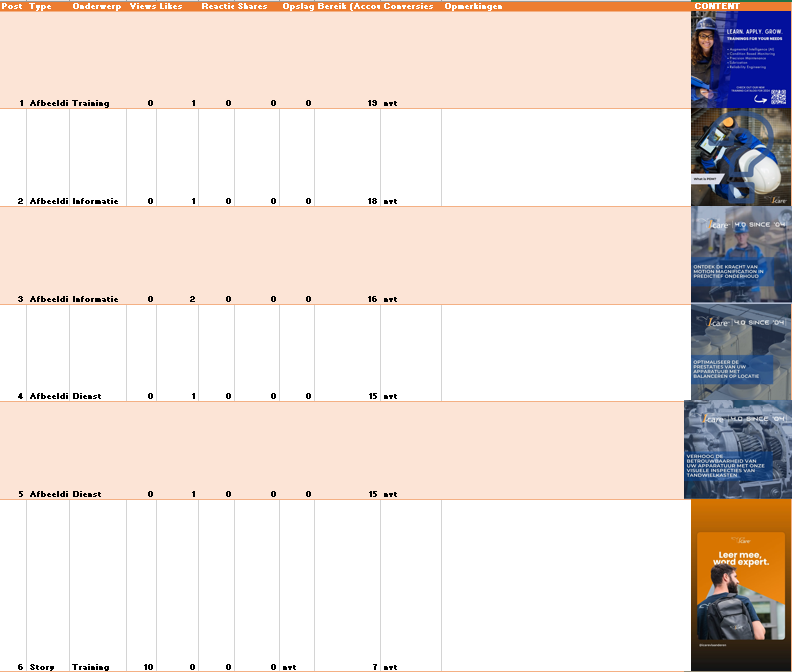 Na het maken van dit plan is er een duidelijke opzet van welke content ik wanneer wil plaatsen. Vervolgens komt het creëren van content, aan de hand van bestaande content in de marketing bibliotheek van I-care én zelf gemaakte content zal ik inhoudelijk invulling geven aan de contentkalender. Vervolgens ga ik de geplaatste content analyseren om inzichten te verkrijgen in de prestaties. Ik zal voor dit leerdoel feedback ophalen bij Marketeers in Mons (het moederbedrijf) en Kimmely Da-Silva Lightvoet (Marketing Specialist in Nederland).