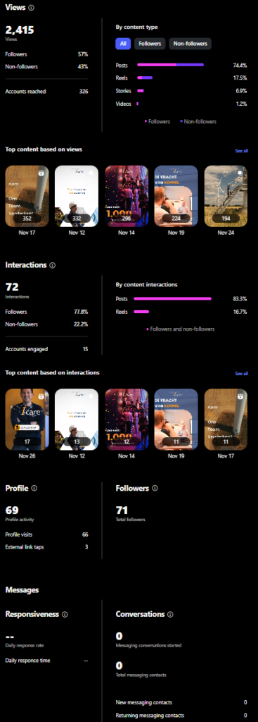 Als we kijken naar al geplaatste content op Instagram presteert het geen van allen, wel is te zien dat het bereik groter is geworden naar mate er is gepost. Om een contentstrategie op te zetten, zullen de algoritmen van Instagram eerst onder de loep worden genomen om een strategie op te zetten (Keita, 2025).