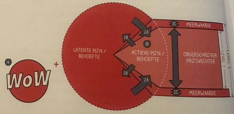 (b) Je maakt de latente pijn hiermee actief en je vergroot de actieve pijn rondom de persoonlijke en organisatie-droom of ambitie. HIerop lever je de beste droomoplossing, vaak samen met andere leveranciers. Je creëert hiermee meetbaar de meeste meerwaarde en maakt het verschil. Dieper in het hartje kan je niet komen!